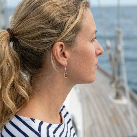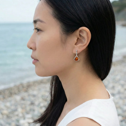 Boucles d'oreilles pendantes ambre cognac goutte en argent rhodié 925