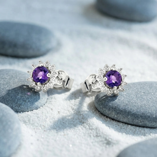 Boucles d'oreilles améthyste puces en argent rhodié 925