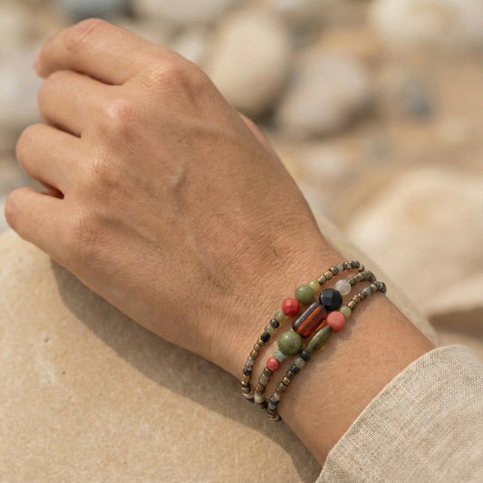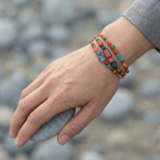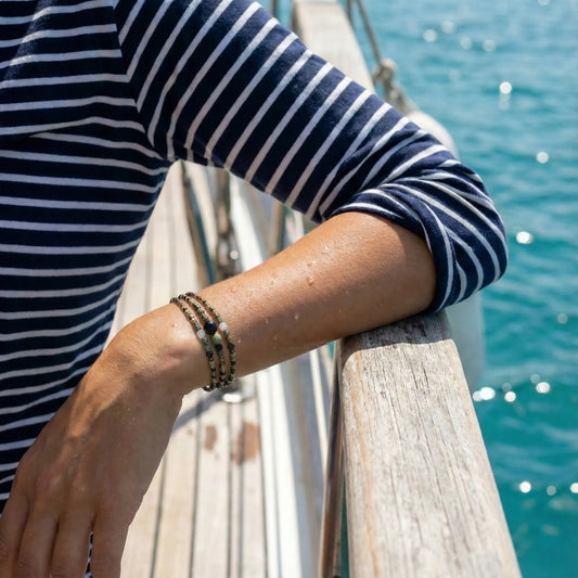 Superposez 3 à 5 bracelets de différentes épaisseurs sur le même poignet. Mélangez pierres naturelles colorées, chaînes fines en argent et créations plus structurées. L'objectif n'est pas la symétrie parfaite mais l'équilibre visuel.