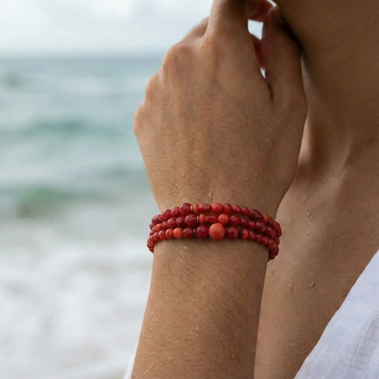 Ambre cognac, cornaline, jaspe : ces minéraux aux tonalités orangées et dorées apportent vitalité et confiance. Ils capturent la chaleur du soleil couchant sur l'océan.