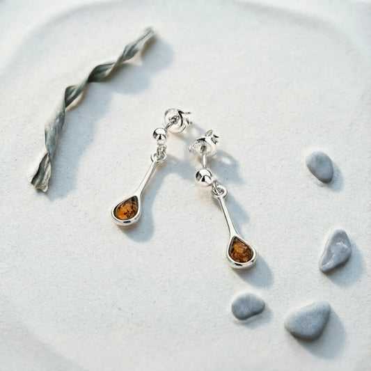 Boucles d'oreilles ambre cognac goutte en argent rhodié 925