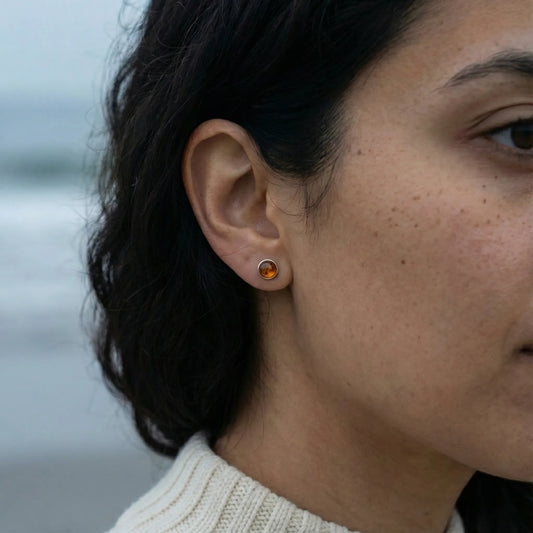 Clous d'oreilles ambre cognac de la mer Baltique rond en argent rhodié 925